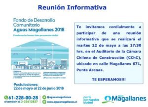 Para facilitar esta etapa de postulación de proyectos, este martes 22 de mayo, a las 17:30 horas se realizará la charla informativa para las organizaciones sociales de Punta Arenas, interesadas en participar de este proceso. La actividad se realizará en dependencias de la Cámara Chilena de la Construcción, ubicada en calle Magallanes N°671 de Punta Arenas.