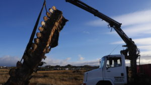 En los últimos días de mayo pasado finalmente se ha concretado el traslado de los restos de la ballena azul (Balaenoptera musculus) que varara en Punta Delgada en el mes de febrero del presente año hasta las inmediaciones del Museo de Historia Natural Río Seco, propiedad de la empresa Algina S.A. Dicha maniobra, se ha realizado de manera exitosa gracias a la gestión del encargado de Medio Ambiente de la Municipalidad de San Gregorio, don José Miguel Sánchez, el alcalde de dicha Comuna, don Edgar Cárcamo y la acción en terreno del operario del camión grúa, don Luis Aguilar. Además, ha sido fundamental la colaboración de don Pedro Aguilar de Transportes Carolina, quien ha dispuesto de un camión con una rampa lo suficientemente larga para poder trasladar el animal desde Punta Delgada hasta Río Seco, contando con la experiencia del chofer, don Enrique Uribe, para dichos fines. En la maniobra para descargar los restos, ha sido fundamental la colaboración del empresario transportista Nikola Baleta y el operario de Algina S.A., don José Carrasco.