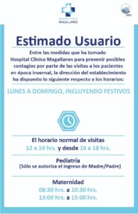 - Se aplica restricción horaria de visitas, de 12 a 14 hrs. y desde 16 a 18 hrs, para todos los pisos con pacientes hospitalizados (Medicina, Quirúrgico, Pensionado). En el caso de Maternidad el horario se restringe de 8:30. a 10:30hrs. y de 13 a 15hrs.