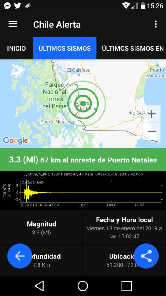 Temblor de 3.3° se produjo esta tarde al norte de Puerto Natales