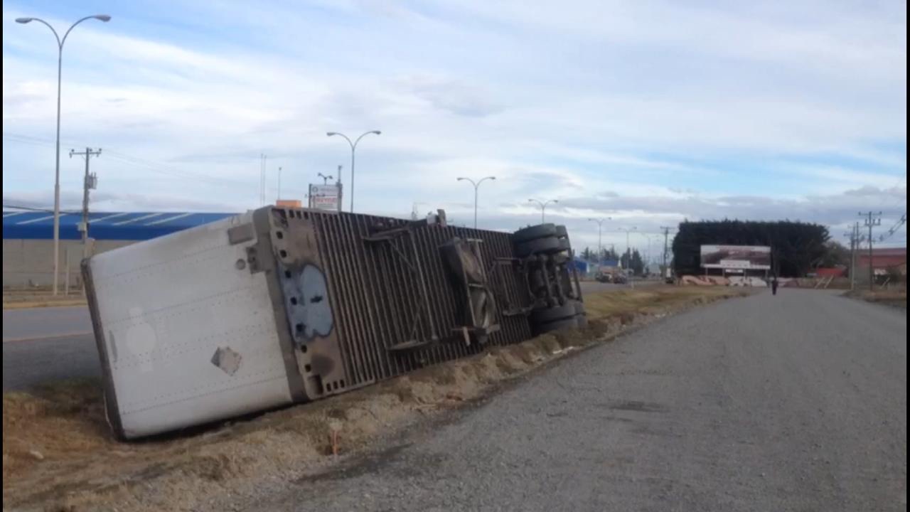Ayer las rachas de viento también tumbaron un camión con rampa en el sector norte de Punta Arenas en la avenida Arturo Merino Benites no resguardándose lesionados.