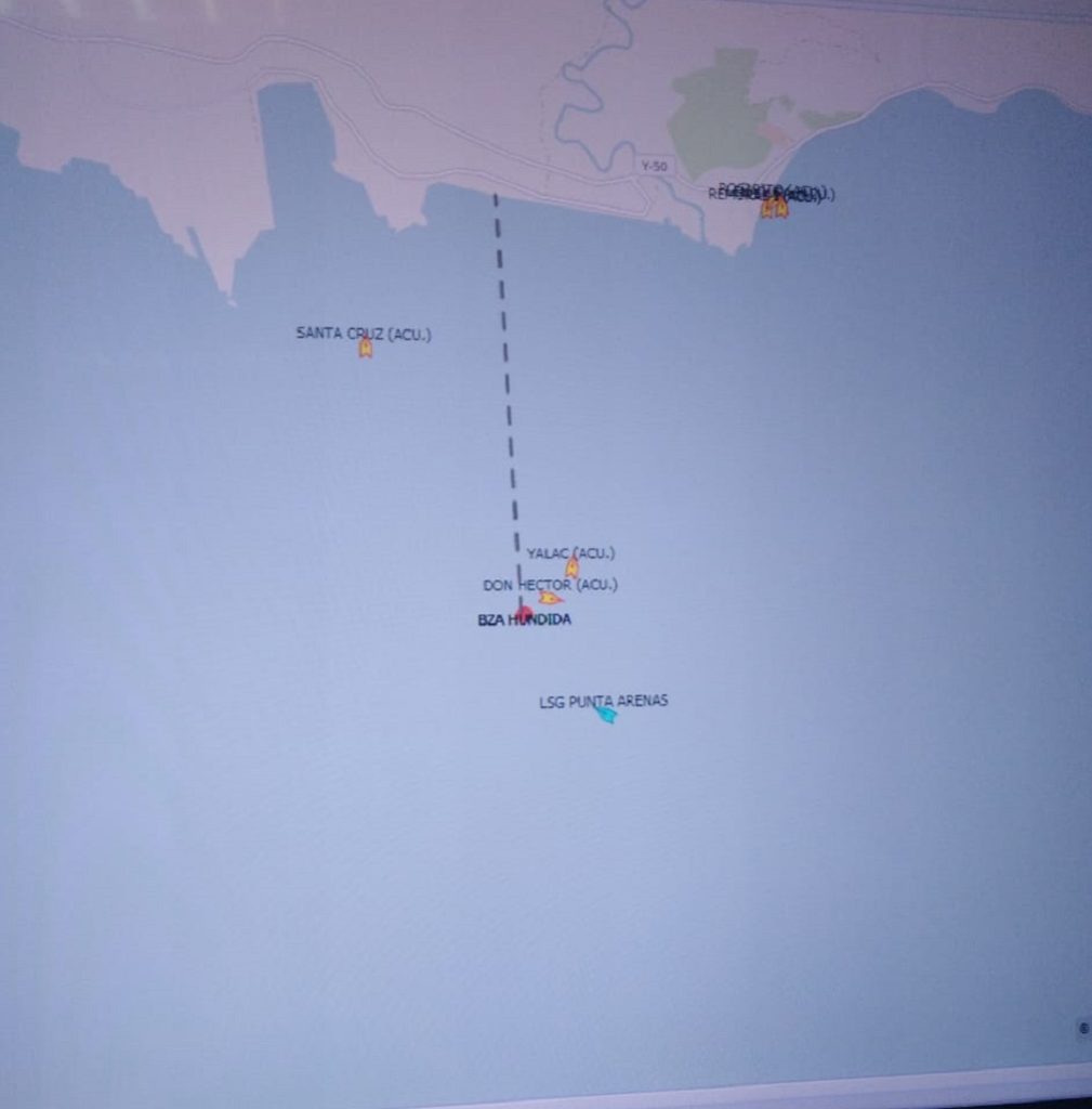 La Tercera Zona Naval Informa que la barcaza Navsur IV fue encontrada hoy a las 19:00 horas hundida A 3.717 mts de la costa norte del seno Skyring, a una profundidad de 106 metros.