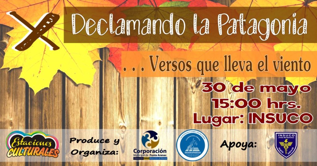 El próximo 30 de mayo a las 15.00 horas se efectuará en el salón de actos del INSUCO de Punta Arenas, el X Encuentro Artístico Literario : «Declamando la Patagonia . . . Versos que lleva el viento » organizado por la Corporación Municipal de Punta Arenas.