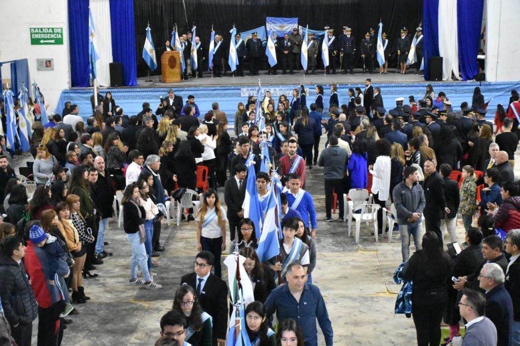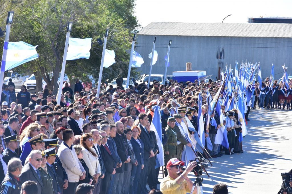 En Los Antiguos el intendente Guillermo Mercado junto a gran parte de su equipo, autoridades, directivos de las escuelas y público en general se reunieron frente al mástil central de la ciudad apenas comenzado el 25 de mayo para entonar las estrofas del Himno Nacional.