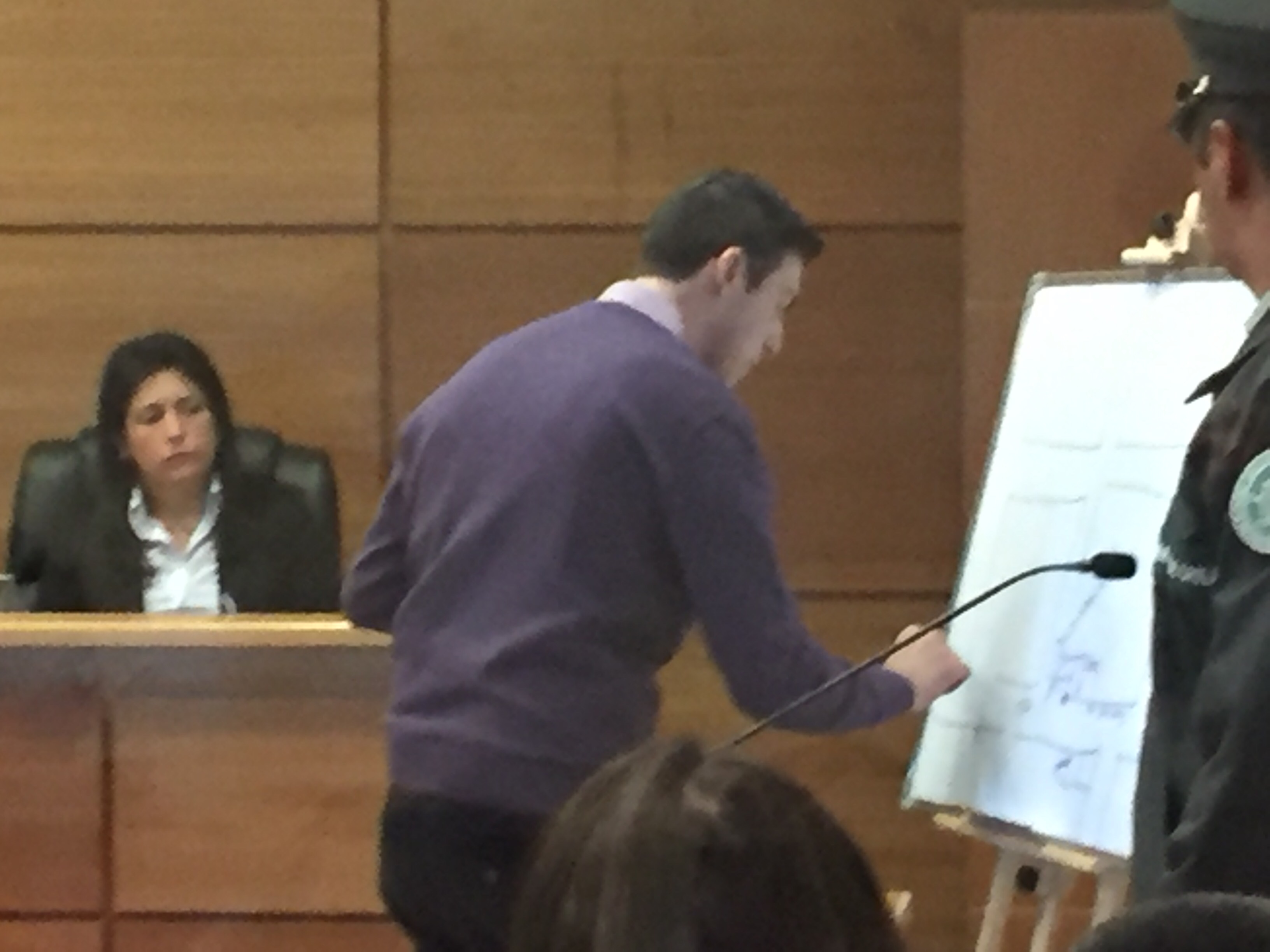 En el primer día de juicio prestó declaración ante los jueces Miguel Delgado, quien en esta oportunidad se apoyó en una exposición gráfica de como presuntamente habrían ocurrido los hechos, lo anterior es parte de la estrategia que instaló su nuevo abogado.