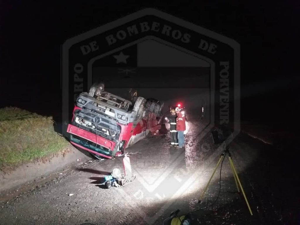 Una Unidad del Cuerpo de Bomberos de Porvenir, BR1, acudió esta tarde de miércoles 22 de mayo hasta el sector Marazzi en la ruta Y-85 de Tierra del Fuego (distante a unos 110 kms. de Porvenir), debido al volcamiento de un camión de transporte de GLP.