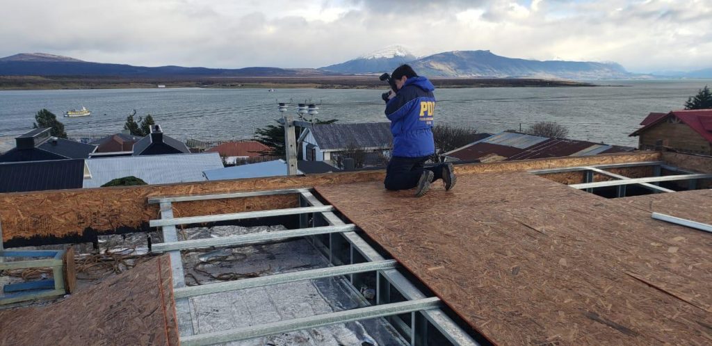 Peritos del Laboratorio de Criminalística junto a la Brigada de Investigación Criminal (Bicrim) Puerto Natales, realizaron trabajos de peritaje en una obra en construcción en la calle Bories de Puerto Natales, lugar donde ayer miércoles 5 de junio ocurrió un accidente laboral que le costó la vida al trabajador Juan Provoste Barría.