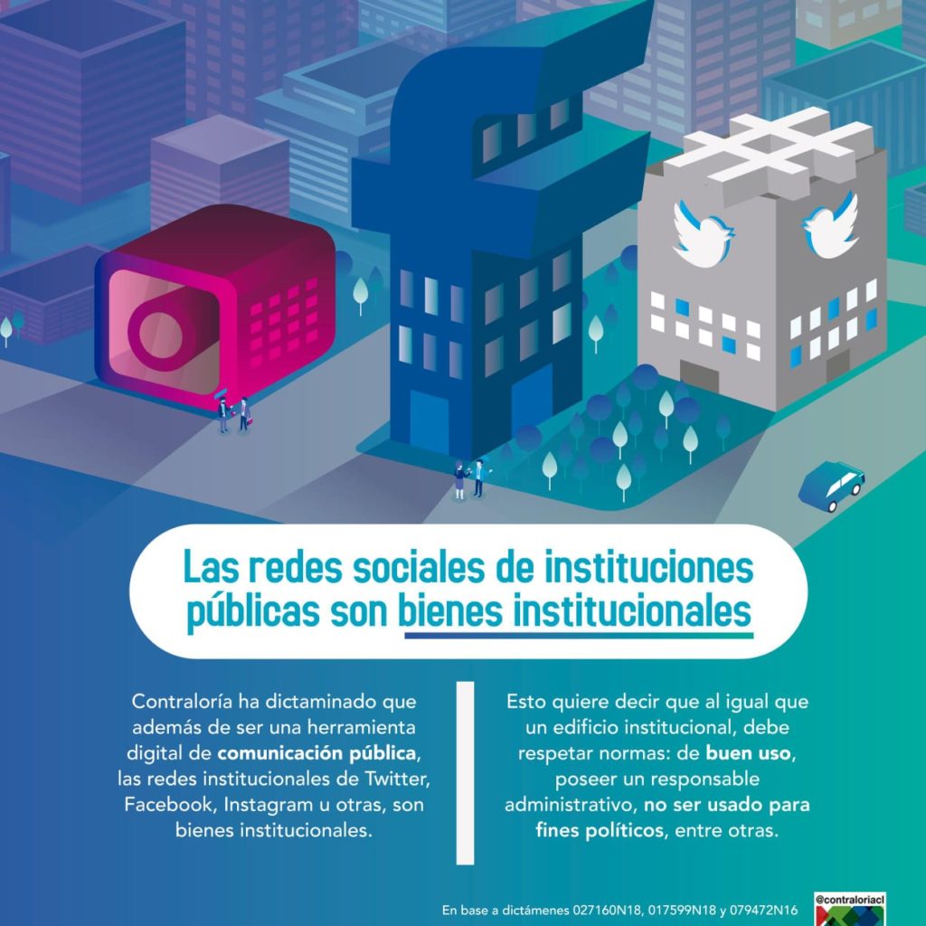 De acuerdo a Contraloría, al ser bienes institucionales, debe respetar normas de buen uso, poseer un responsable administrativo, y no ser usado para fines políticos o personales, entre otros. A su vez, ningún servicio ni autoridad pública puede bloquear el acceso de un usuario a las redes sociales institucionales.