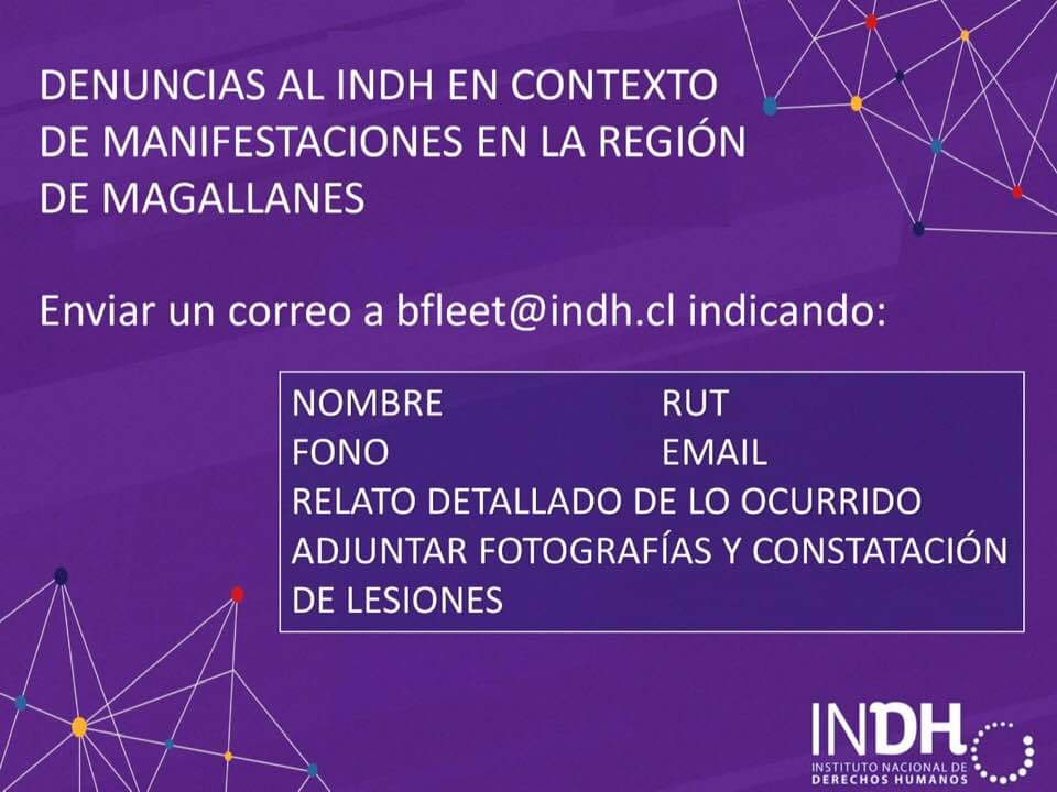 El INDH informa acerca del procedimiento para efectuar denuncias por eventuales violaciones a los Derechos Humanos en Magallanes, en el marco del estado de emergencia.