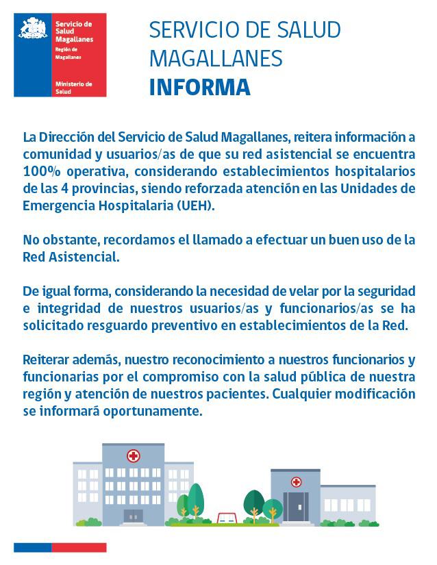 Servicio de Salud Magallanes informa que toda la red asistencial hospitalaria de la región está funcionando normalmente Ovejero Noticias 21 de octubre de 2019 NOTICIAS, SALUD PUBLICA, TITULARES Compartir6TwittearCompartirPin6 Compartir