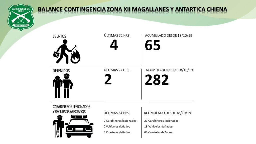 El Balance de contingencia policial de Carabineros publicado este lunes 18 de noviembre arroja 2 detenidos este fin de semana en la región de Magallanes y 282 detenidos en total, desde el inicio de las manifestaciones ciudadanas el 18 de octubre pasado.