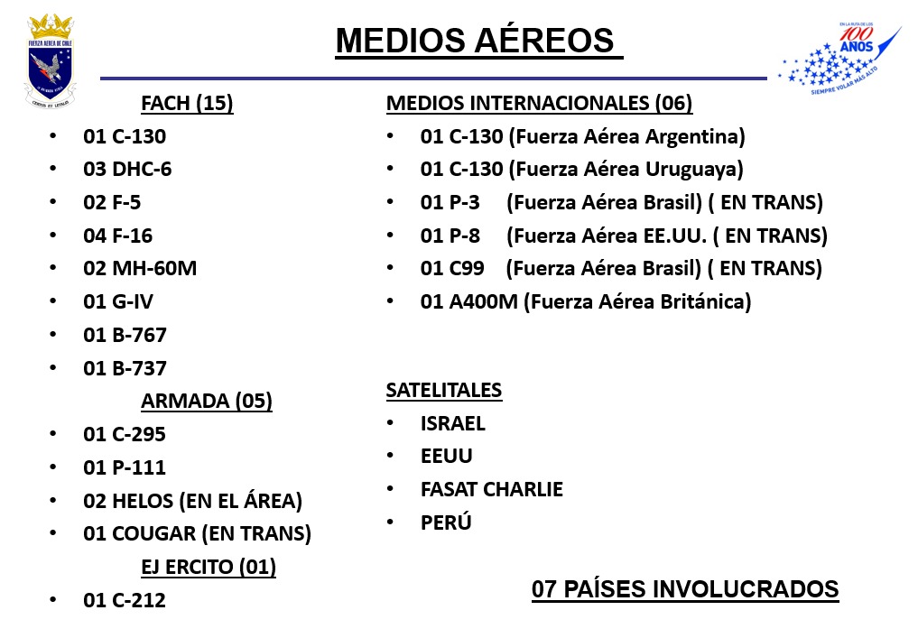 En las operaciones de búsqueda participan un avión C-130 de la Fuerza Aérea Argentina y unidades de la Fuerza Aérea Uruguaya, de la Fuerza Aérea de Brasil y de la British Air Force, como señala la gráfica adjunta.