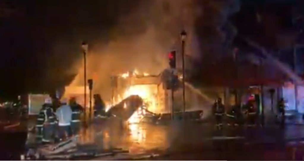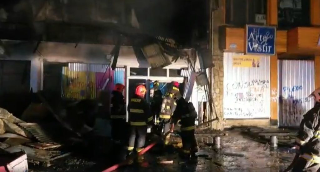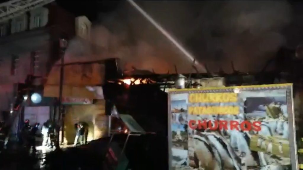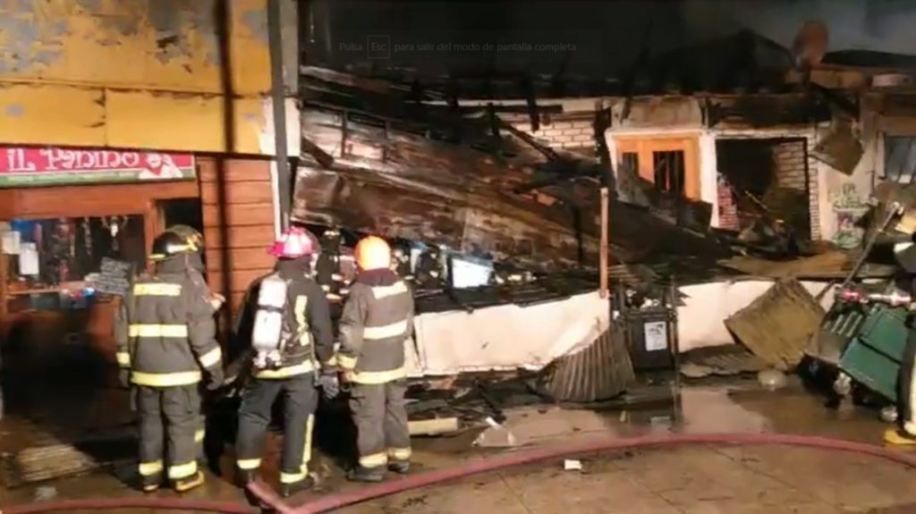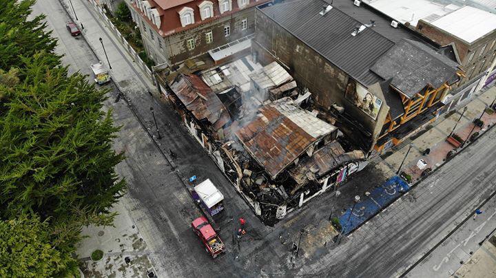 Cuatro locales comerciales y dos kioscos resultaron completamente destruidos por el fuego en un incendio que se declaró esta madrugada de sábado 1 de febrero a las 0.30 horas, en pleno centro de Punta Arenas, en la intersección de Avenida Colón y Bories.