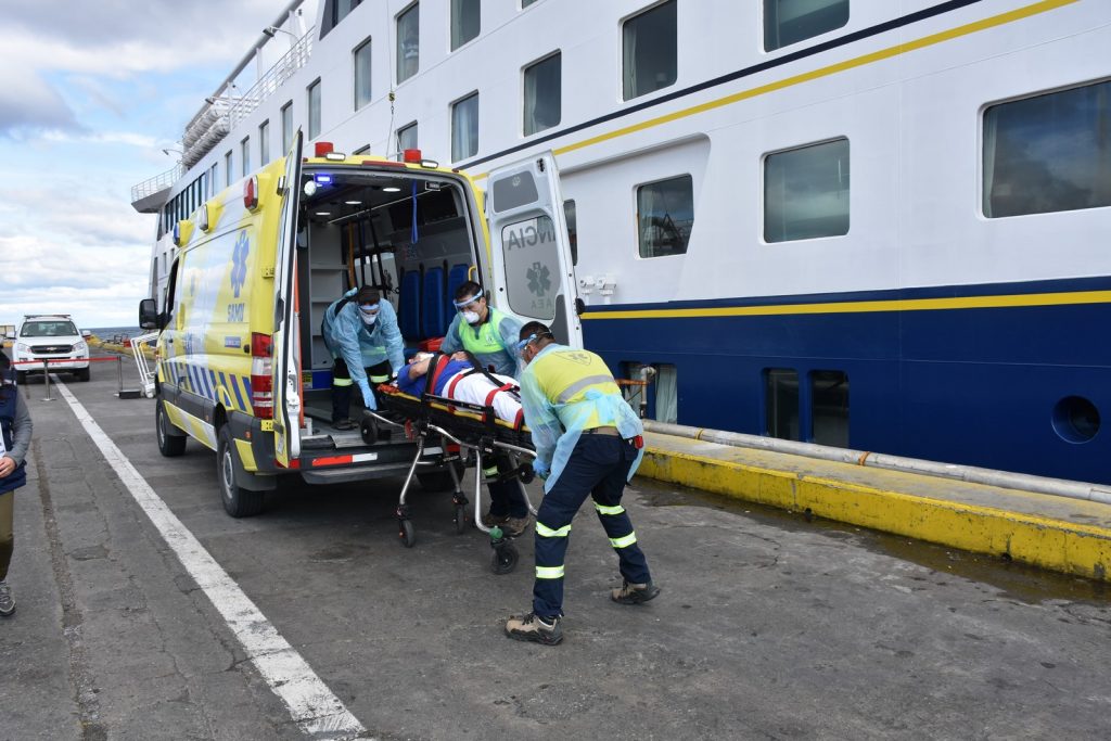 El simulacro desarrollado desde el Muelle Fiscal Arturo Prat de Punta Arenas, evaluó los tiempos de respuesta y preparación de los dispositivos a cargo, considerando el traslado en móvil SAMU al Hospital Clínico Magallanes y la activación de protocolos en la atención brindada en el centro de referencia regional.