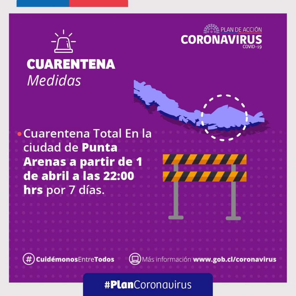El Intendente Regional José Fernández informó este mediodía que la ciudad de Punta Arenas se encontrará bajo cuarentena total, desde las 22.00 horas de este miércoles 1 de abril y durante 7 días.