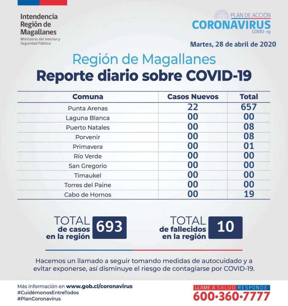 El informe entregado esta mañana por el MINSAL arroja 22 nuevos casos de Covid19 en la región de Magallanes, 10 personas fallecidas y 693 casos en total al 28 de abril, según cifras consolidadas al 27 de abril a las 21.00 horas.
