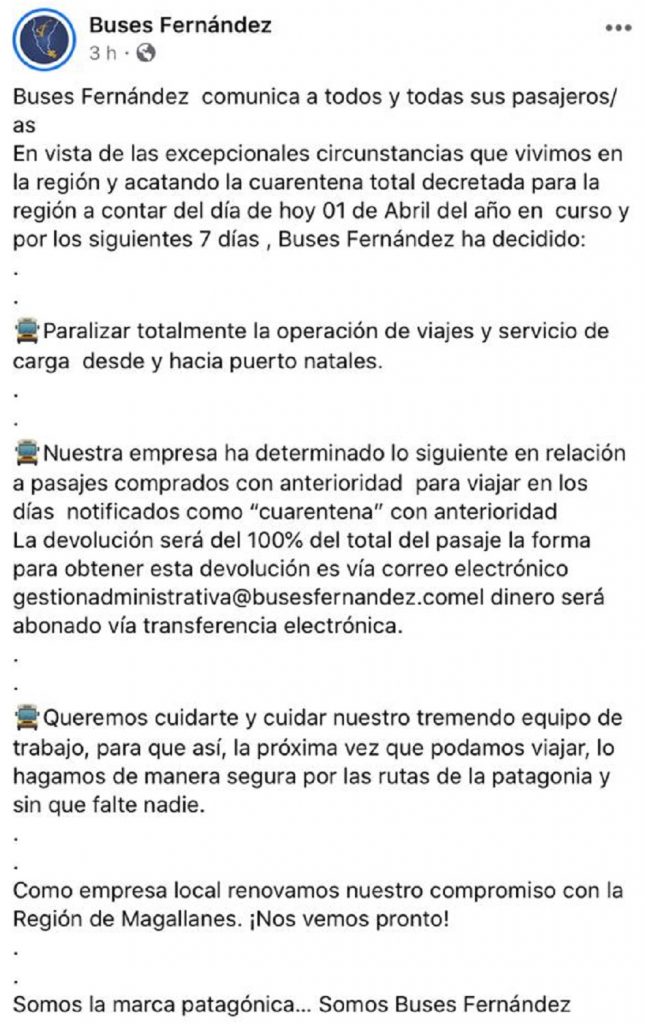 La compañía regional Buses Fernández informó mediante redes sociales a todos sus clientes y a la comunidad magallánica que ha decidido suspender sus viajes hacia y desde la ciudad de Puerto Natales, como consecuencia de la cuarentena total decretada en la comuna de Punta Arenas.