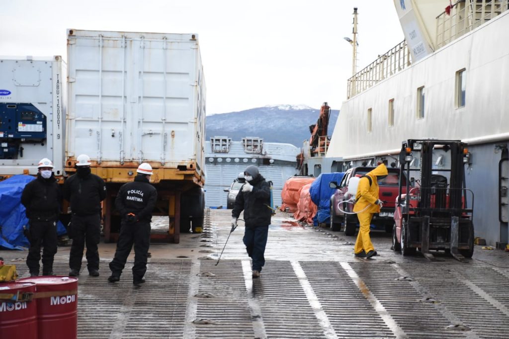 En la rampa Puerto Williams se registraron operaciones de descarga del ferry Yaghan, que trasladó abastecimiento para isla Navarino, las cuales se realizaron conforme a los protocolos sanitarios vigentes (fotografías proporcionadas por Armada de Chile).