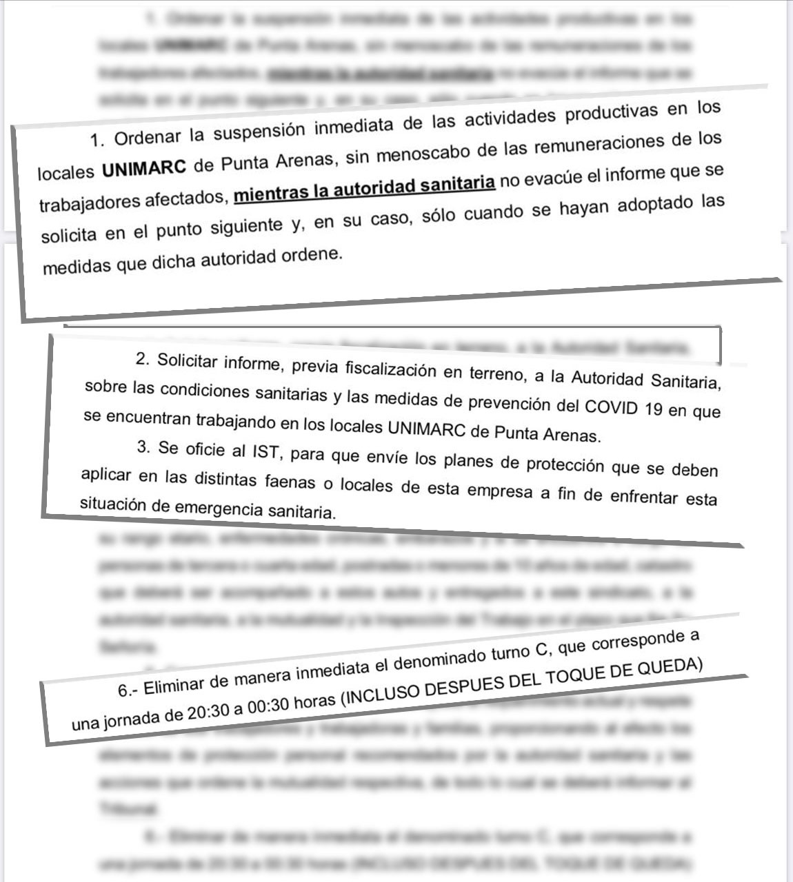 El abogado Pedro Venegas, del Sindicato de Trabajadores de UNIMARC informó que otra de las medidas instruidas por el tribunal laboral a la autoridad sanitarias, es que previa fiscalización en terreno, emita un informe sobre las medidas sanitarias y de prevención del COVID-19 en que se encuentra trabajando el personal. Por otro lado se debe oficiar al IST para que se envíe los planes de protección que se deben aplicar en las distintas faenas o locales de esta empresa.