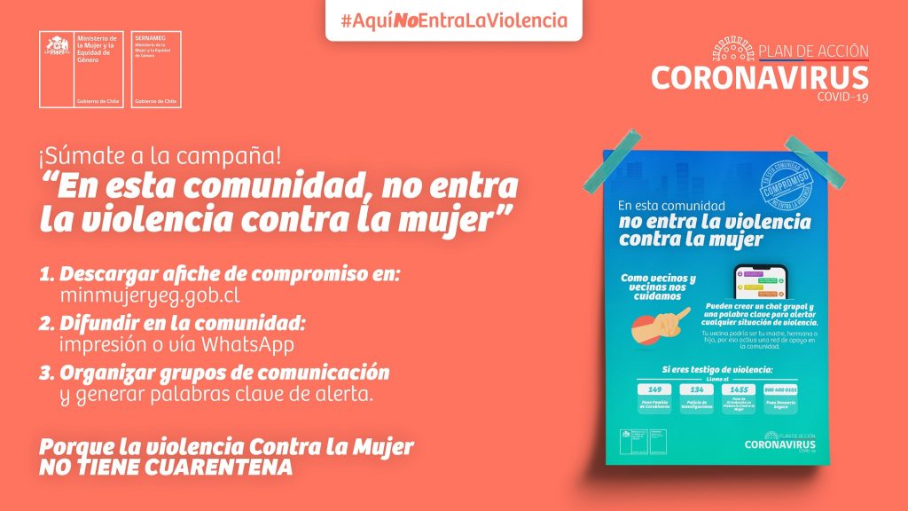 El afiche está disponible en el sitio web del Ministerio de la Mujer www.minmujeryeg.gob.cl en formato descargable, para que cualquier comunidad que quiera sumarse a esta campaña pueda hacerlo y se insta además a los vecinos y vecinas a crear un chat grupal y acordar una palabra clave para alertar ante cualquier situación de riesgo.