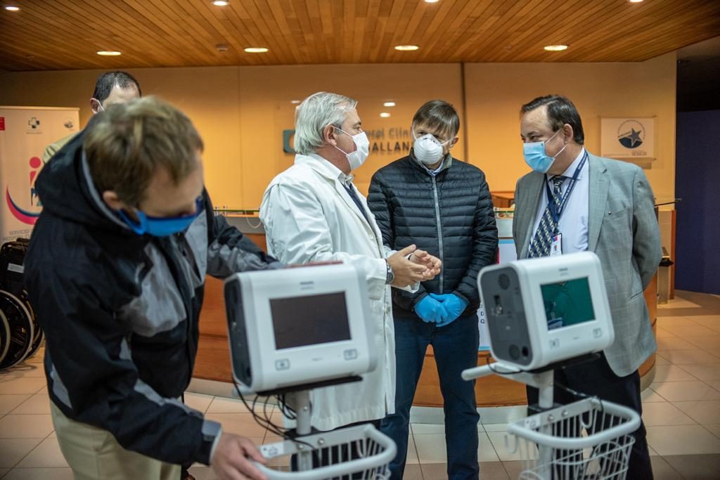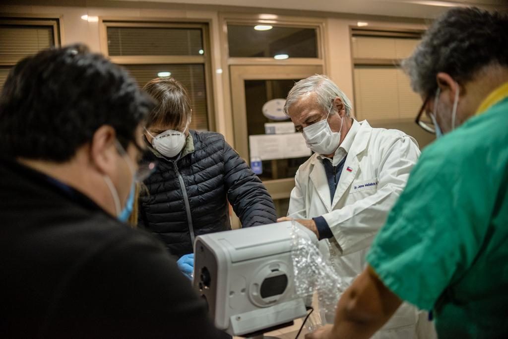 A su arribo al Hospital, el Ministro fue controlado en su temperatura por una funcionaria del Hospital Clínico e hizo entrega del equipamiento médico traído desde Santiago, consistente en dos ventiladores mecánicos y equipamiento médico.