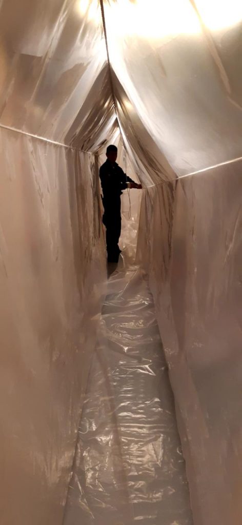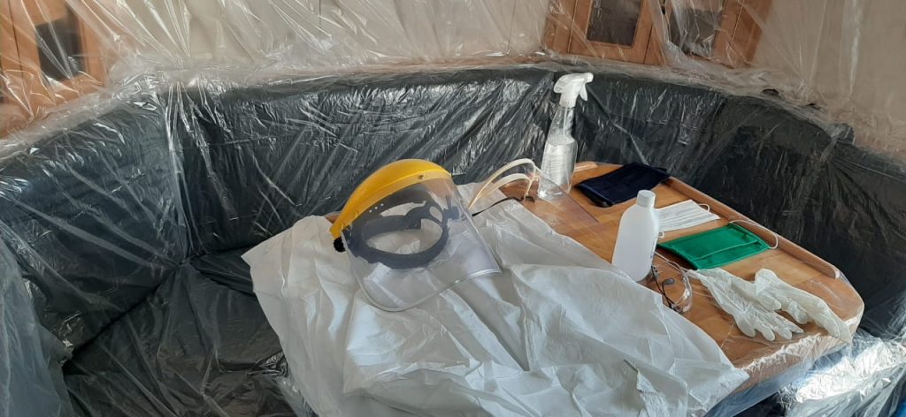 La implementación de la dependencia tiene como objetivo aislar al paciente y la tripulación, manteniendo así un tránsito reducido y con las comodidades necesarias para su traslado. Para ésto se construyó una estructura de tubos de PVC y plástico, que permite mantener aislamiento del paciente, sumado a medidas de sanitización previas y posteriores, configurando una zona aislada dentro de la unidad.