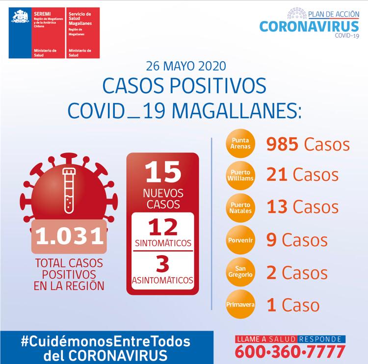 14 de la ciudad de Punta Arenas y 1 de Puerto Natales. 12 sintomáticos y 3 asintomáticos.