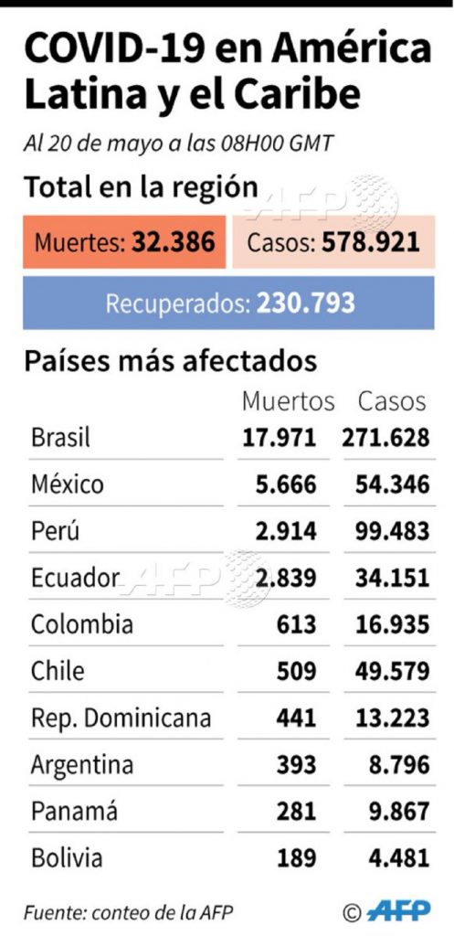 El informe diario elaborado por la Agenda France Press sobre la base de información oficial de cada país de América Latina, reporta el número total acumulado de personas fallecidas y de casos totales de contagio de Covid19 en la región latinoamericana.