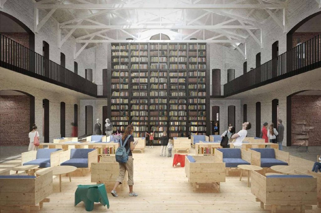 La biblioteca estará en el área central de la ex cárcel, que poseerá un anillo de salas de lectura y en el centro albergará estanterías para las colecciones generales de acceso libre.