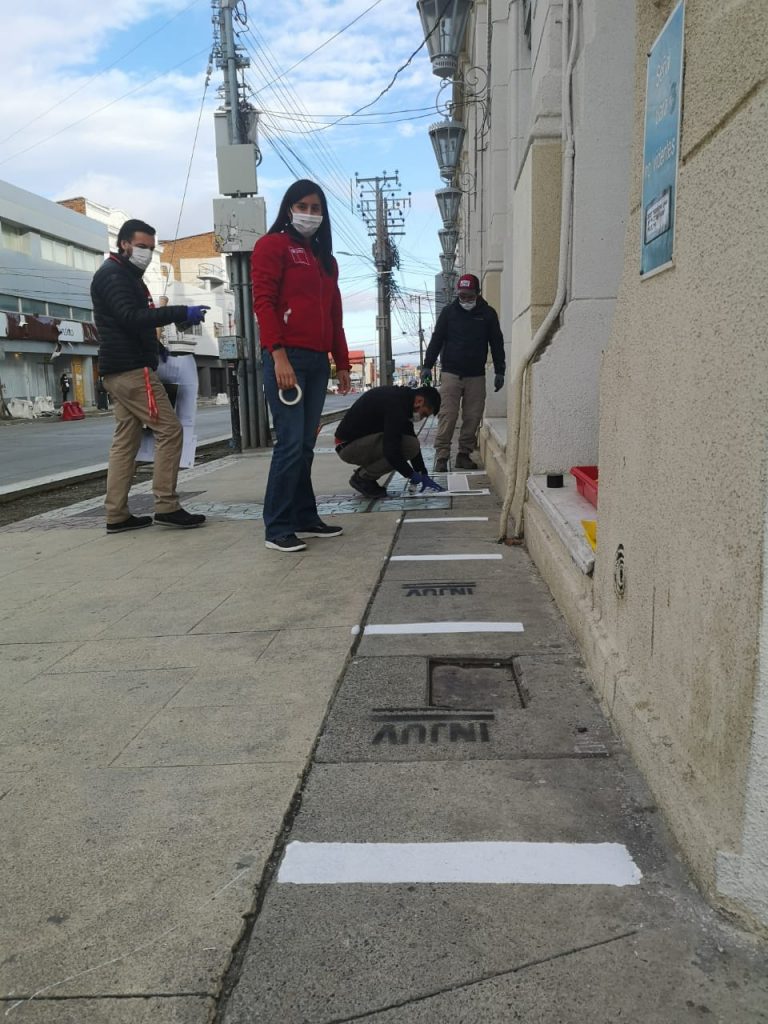 La iniciativa de pintar líneas de distanciamiento social en espacios públicos nace desde el Instituto Nacional de la Juventud, y en Magallanes se trabajó está actividad con la colaboración de la Seremi de Desarrollo un Social y Familia, quién gestionó las autorizaciones y los materiales para efectuar las demarcaciones de las salidas de estos lugares.