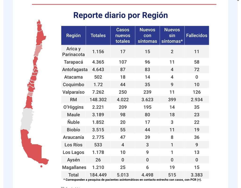 En materia de exámenes, a la fecha a nivel regional se han realizado 9.387 PCR. La positividad es de 12,89%.