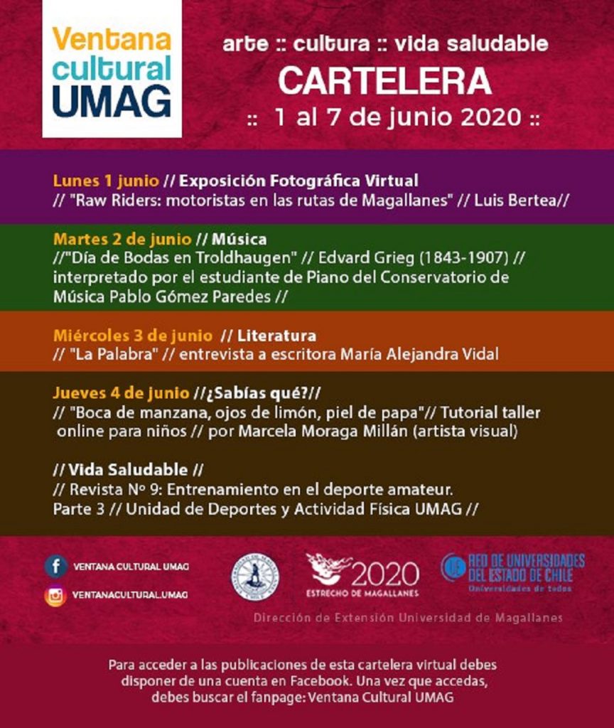 Cartelera Cultural de Magallanes: semana del 1 al 7 de junio de 2020 Ovejero Noticias 1 de junio de 2020 NOTICIAS, TITULARES CompartirTwittearCompartirPin0 Compartir