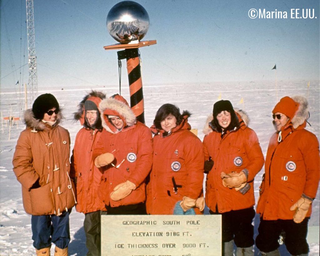 Pie fotografía: Pamela Young, Jean Pearson, Terry Tickhill Terrell, Lois Jones, Eileen McSaveney y Kay Lindsay fueron las primeras mujeres en pisar el Polo Sur, en noviembre de 1969. Todas ellas son norteamericanas, excepto Pamela Young que proviene de Nueva Zelanda. Fotografía: US Navy.
