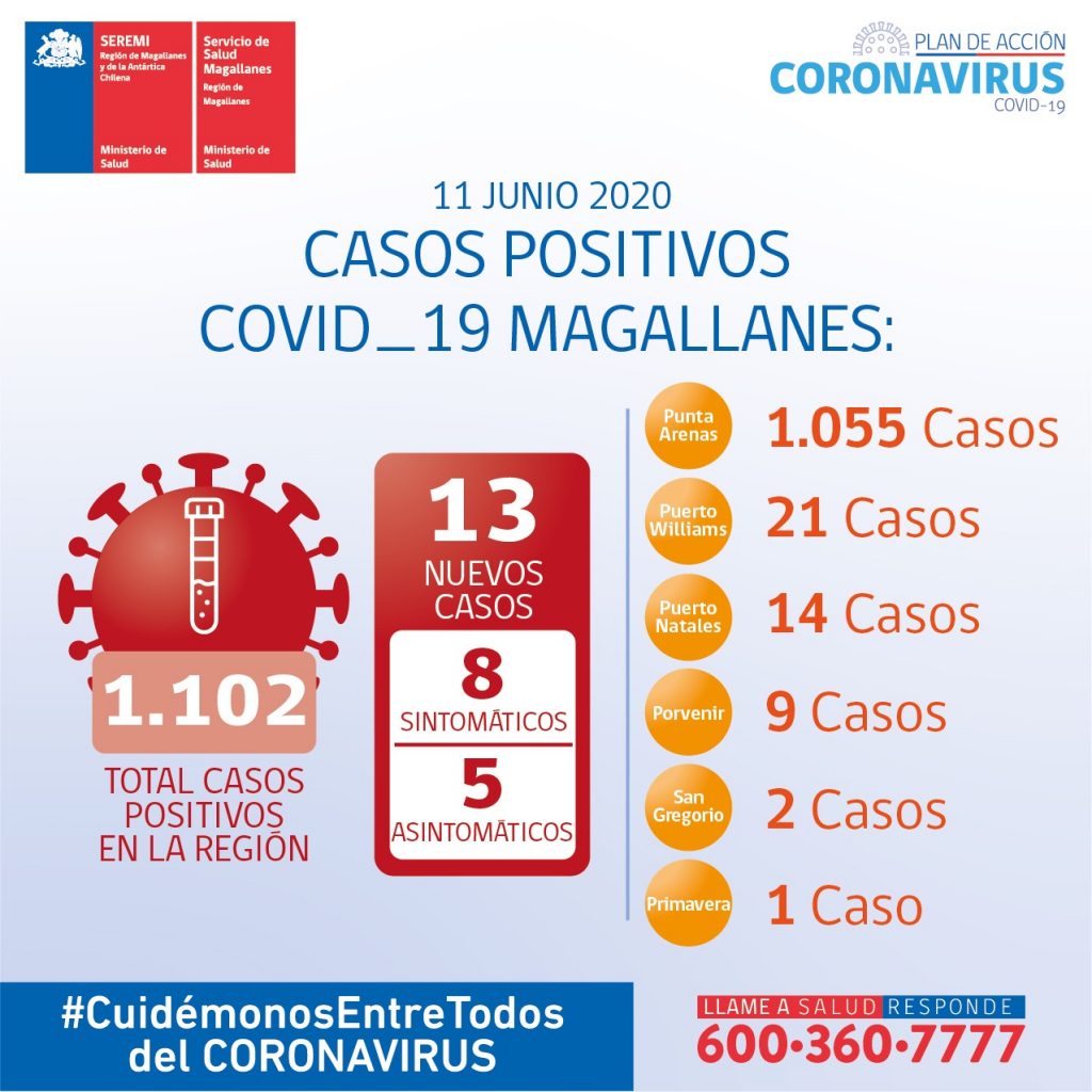 La autoridad regional de salud, Mariela Rojas Ramírez, informó que de acuerdo al sistema EPIVIGILA del Ministerio de Salud, hoy en Magallanes se notificaron 13 casos nuevos de COVID-19, todos correspondientes a la ciudad de Punta Arenas. 8 casos sintomáticos y 5 asintomáticos.