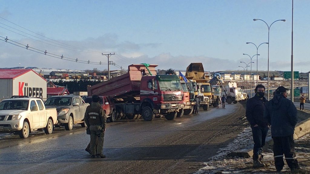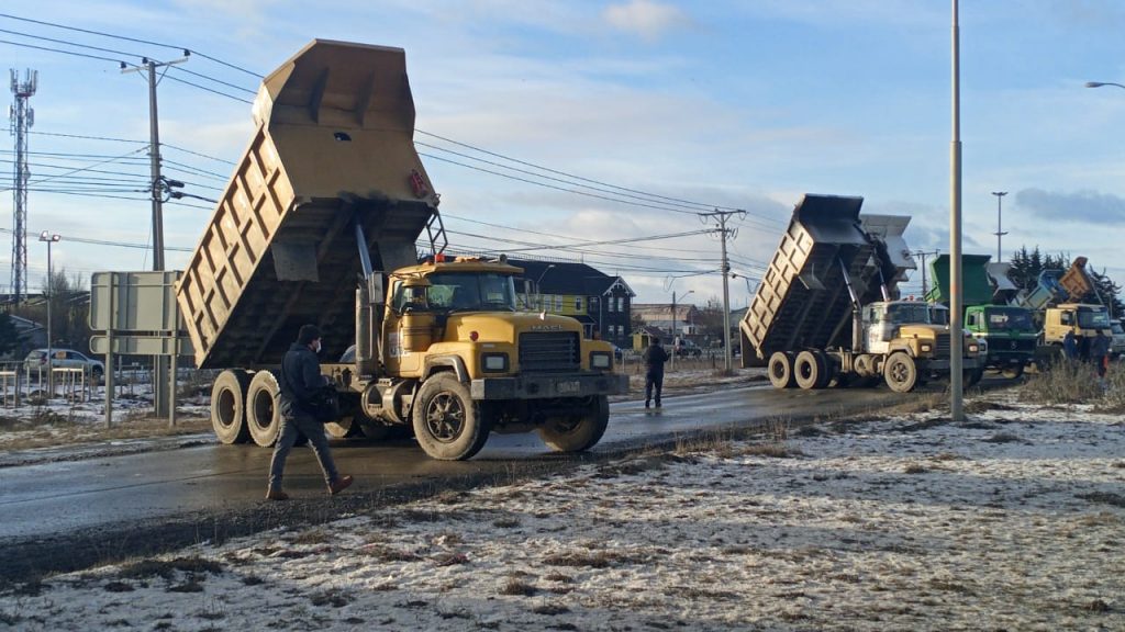 Camioneros de extracción de áridos protestan contra el Alcalde de Punta Arenas y cortan cruce de Avenida Frei con Ruta 9