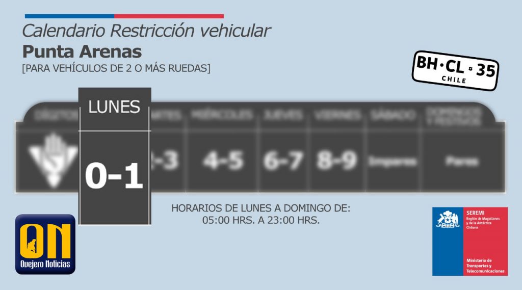 Restricción vehicular en Punta Arenas para este lunes 14 de septiembre: 0-1 Ovejero Noticias 14 de septiembre de 2020 NOTICIAS, PUNTA ARENAS, TITULARES CompartirTwittearCompartirPin0 Compartir