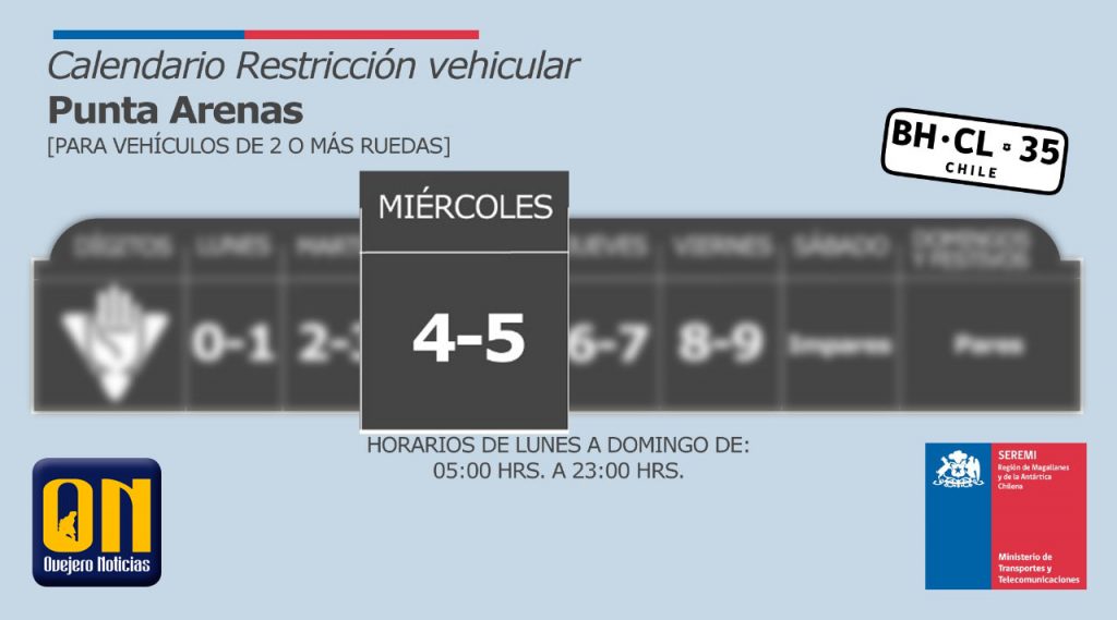 Restricción vehicular en Punta Arenas para este miércoles 16 de septiembre: 4 y 5 Ovejero Noticias 16 de septiembre de 2020 NOTICIAS, PUNTA ARENAS, TITULARES CompartirTwittearCompartirPin0 Compartir