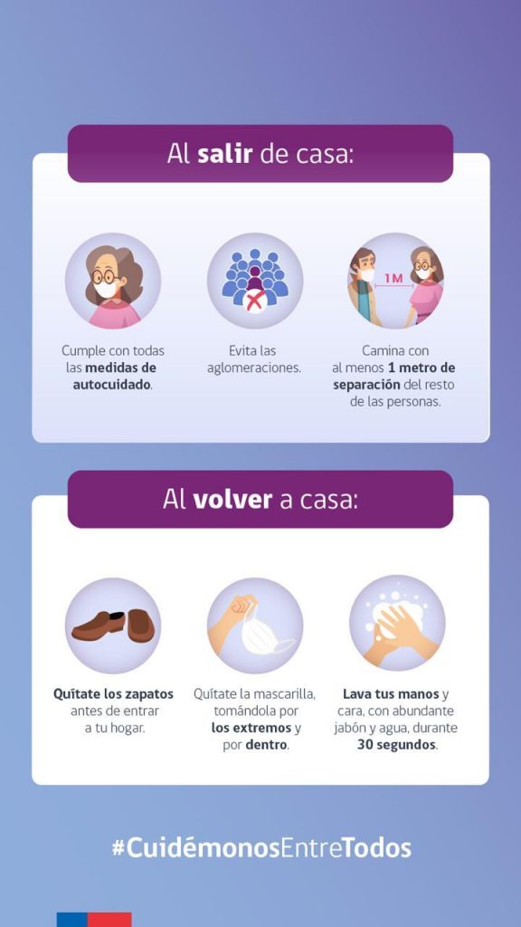 Al salir de casa se recomienda cumplir con todas las medidas de autocuidado, como uso de mascarilla, evitar aglomeraciones y caminar con al menos un metro de separación del resto de las personas. En tanto al volver a casa se recomienda quitarse los zapatos antes de entrar a su hogar, sacar la mascarilla tomándola por los extremos y por dentro; y finalmente lavarse manos y cara con abundante agua y jabón durante 30 segundos.