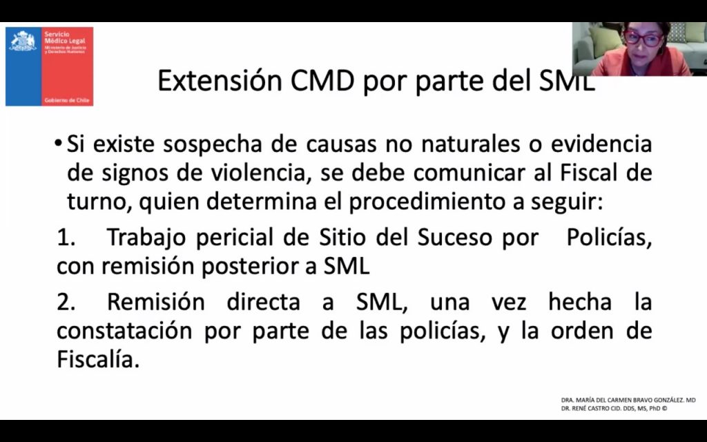 La charla virtual fue gestionada por la dirección regional del servicio junto al Instituto Dr. Carlos Ybar (ICY), y sus relatores fueron la perito tanatóloga Dra. María del Carmen Bravo González y el Director Regional del SML, Dr. René Castro Cid. Asimismo, participaron como autoridades invitadas los directores del SML de las regiones de Arica y Parinacota, Tarapacá, Ñuble y Aysén.