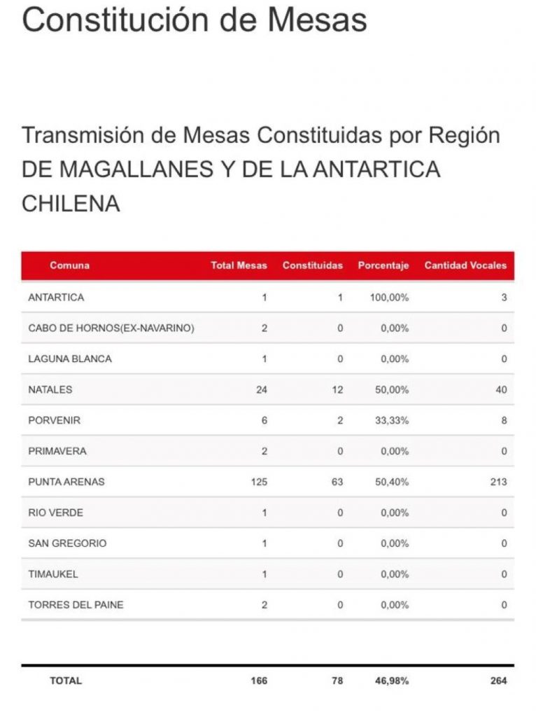 Un bajo nivel de constitución de mesas se observó ayer 28 de noviembre en la región de Magallanes para las primarias de Gobernadores Regionales y Alcaldes que tienen lugar este domingo 29 desde las 08.00 horas. Solo se constituyó la mitad de las mesas receptoras de sufragios.