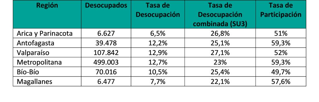 Otro indicador relevante para la región es la brecha entre las tasas de desocupación y desocupación combinada (SU3 ). La primera de ellas disminuyó hasta llegar a un 7,7%, mientras que SU3 también bajó y actualmente se encuentra en 22,1%. Es importante destacar que antes de la emergencia sanitaria, la diferencia entre estas dos tasas se mantenía estable y alrededor de un 6%. Sin embargo, tras siete meses de pandemia, la diferencia entre ambos indicadores aumentó de forma notoria, encontrándose actualmente en un 14,4% a nivel regional.