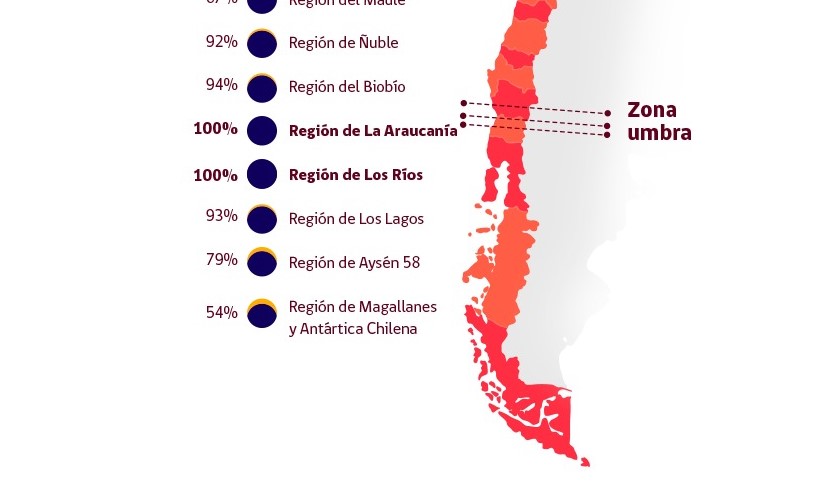 El eclipse será visible en todo Chile con una diversidad de dimensiones, pero la zona umbra, es decir la franja territorial que podrá presenciar el 100% de oscuridad se encuentra en la región de la Araucanía.