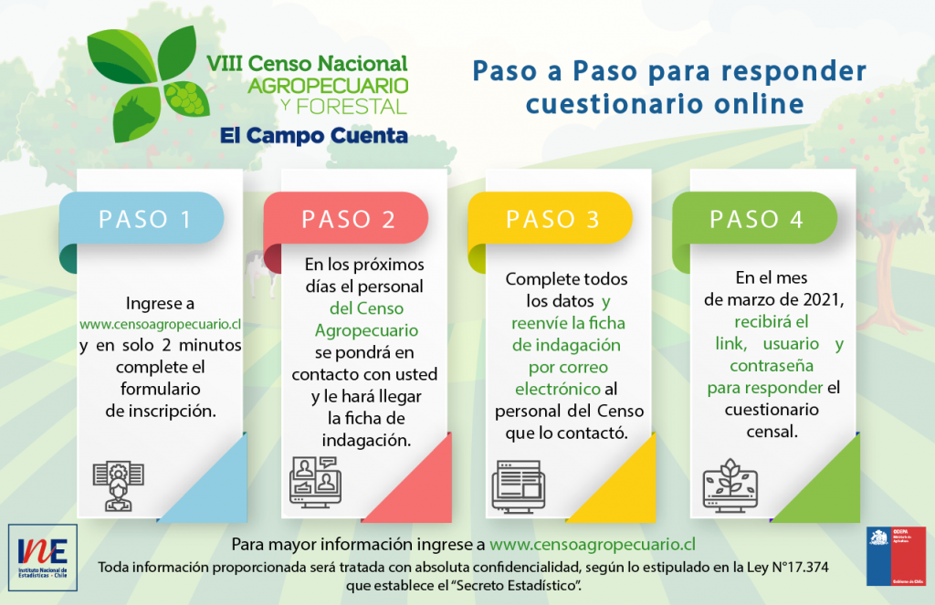El formulario de inscripción para acceder al cuestionario censal online se encuentra disponible en www.censoagropecuario.cl y en www.ine.cl hasta el 31 de enero 2021. En los días siguientes a haberlo completado, personal del Censo Agropecuario se pondrá en contacto con el productor y le hará llegar la ficha de indagación. Con todos los datos completados, la ficha de indagación deberá ser enviada por correo electrónico al personal del Censo que lo contactó. En marzo de 2021, el productor recibirá el enlace, usuario y contraseña para responder el cuestionario censal por internet, y contará con asistencia en línea proporcionada por el INE.