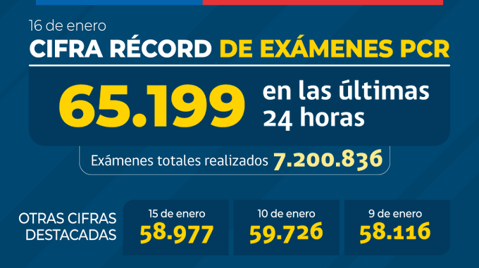 MINSAL informa nueva cifra alta de exámenes PCR realizados en las últimas 24 horas y que alcanzan los 65.199 test, con un total de 7.200.836 a la fecha. El Ministro de Salud señaló que » «Hemos logrado el número de 65.199 test, con un total de 7.200.836 a la fecha, lo que nos posiciona como uno de los países que más testeos realiza.»