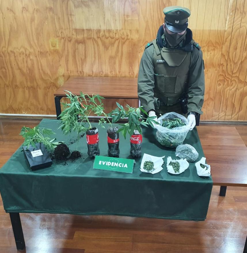 En el domicilio, Carabineros hizo el hallazgo de un cultivo ilegal de plantas del género Cannabis Sativa, incautándose cinco plantas de entre 40 a 70 cm de altura y más de 589 gramos de marihuana elaborada.