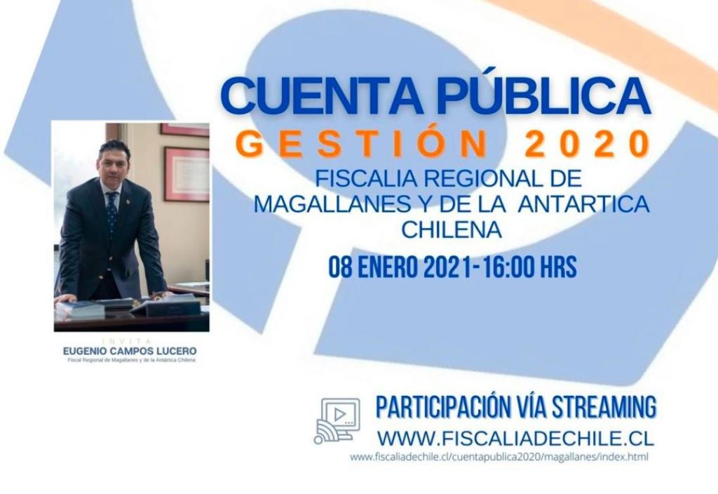 Punta Arenas, 06/01/2021 Este viernes 8 de enero, a partir de las 16.00 horas, el Fiscal Regional de Magallanes y de la Antártica Chilena, Eugenio Campos Lucero, rendirá ante la comunidad, cuenta pública anual de la gestión 2020 del Ministerio Público.