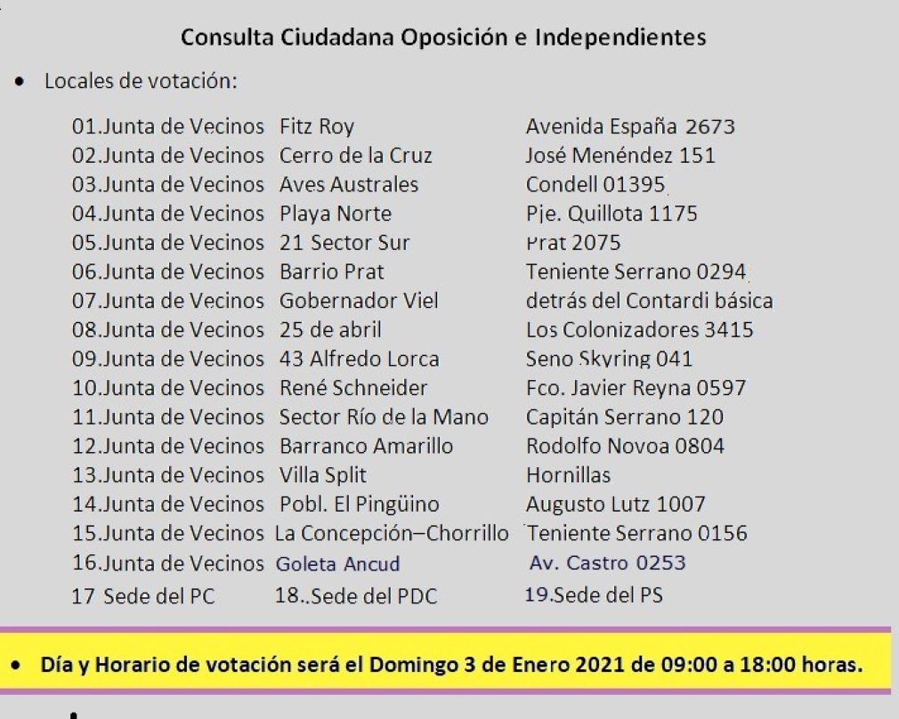 Los locales de votación, que funcionarán el domingo 3 de enero desde las 09.00 horas hasta las 18.00 horas son los siguientes: