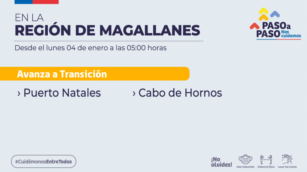 A partir de este lunes 4 de enero a las 05.00 horas, las comunas de Puerto Natales y Cabo de Hornos pasan a la fase 2 de transición en el Paso a Paso.