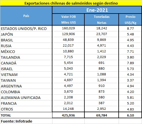 Así se desprende de las últimas cifras proporcionadas por InfoTrade. Según los datos al mes de enero de 2021, Chile exportó en el primer mes del año salmones y truchas por US$ 425 millones, con un total de 69.784 toneladas netas, y un precio promedio de US$ 6,10/kg.