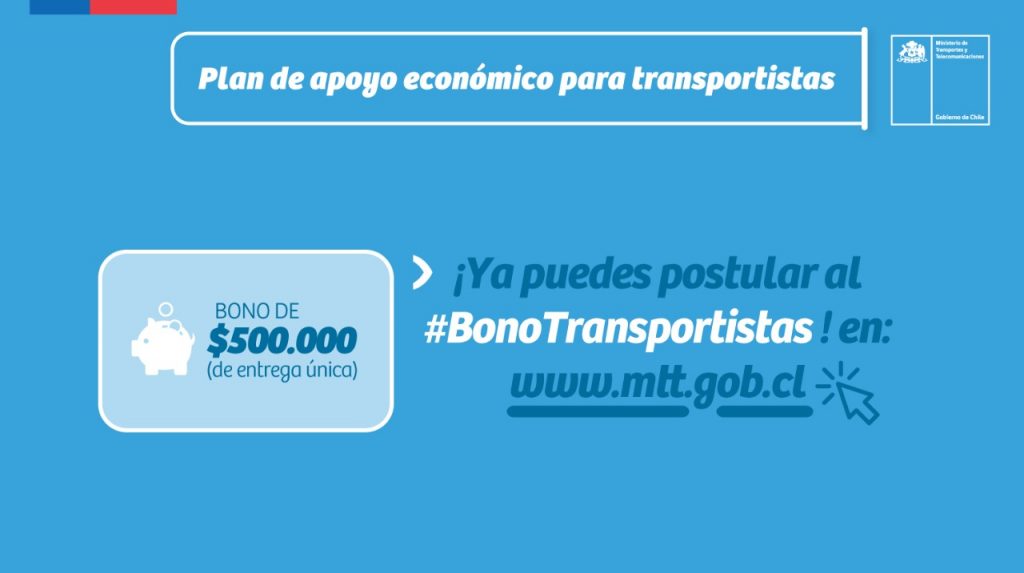A partir de hoy propietarios y conductores de taxis básicos, colectivos, ejecutivos y de turismo; buses y minibuses urbanos y rurales y furgones escolares, pueden postular al nuevo bono de $500 mil en apoyo al sector y que se solicita en la plataforma habilitada en la página del ministerio de Transportes y Telecomunicaciones www.mtt.gob.cl.